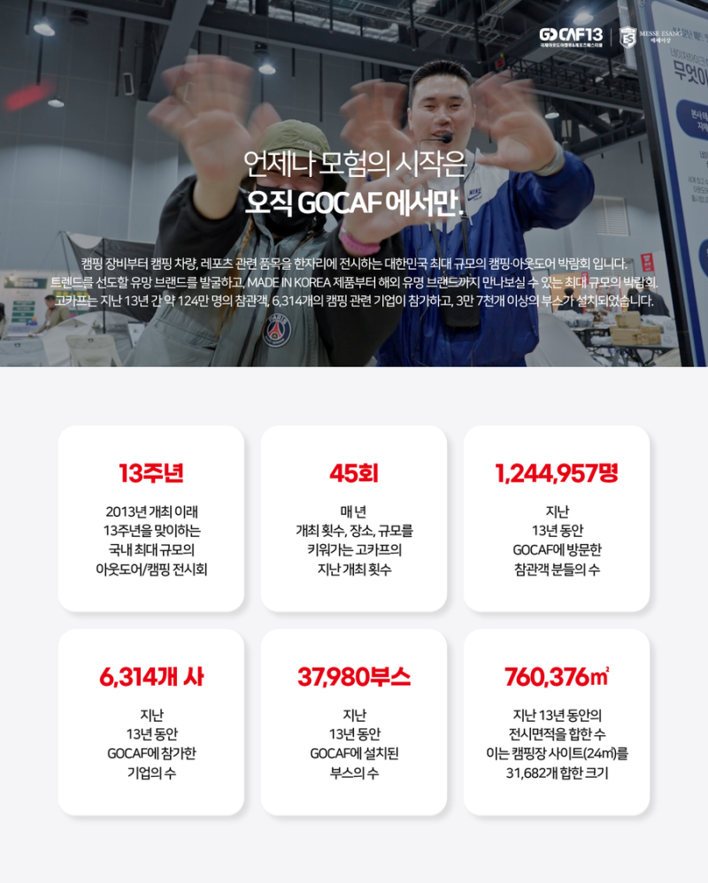 ✅13년 간 약 124만 캠퍼들이 방문하고 3만 7천여 개의 부스가 설치된 대한민국 대표 캠핑&레포츠 페스티벌 고카프!