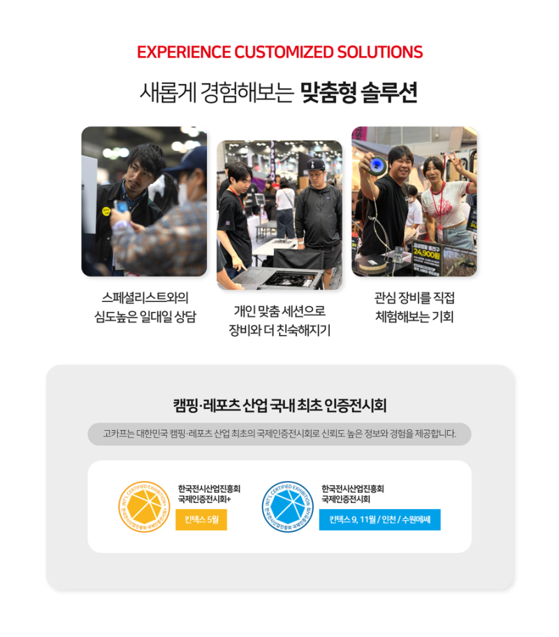 고카프는 대한민국 캠핑·레포츠 산업 최초의 국제인증전시회로 신뢰도 높은 정보와 경험을 제공합니다.