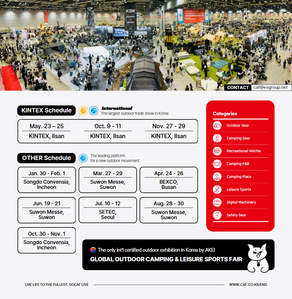 Due to dramatic growth from camping industry of Korea, GOCAF has been spotlighted as Korea’s leading exhibition for outdoor & leisure sports industry. GOCAF is the best platform where professional buyers and new customers visit to explore about Korea’s outdoor sports marketplace since 2013.