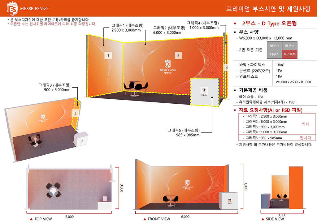 | 3m X 3m | 1,800,000원 (VAT 별도) | - 전시 면적만 제공(4부스 이상부터 신청 가능) *외부 시공사 통해 설치 시 2부스부터 가능 - 필수: 파이텍스(카페트) 또는 바닥 자체 시공 - 필수: 전기 시공 |